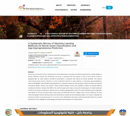 باحثان من كلية تكنولوجيا المعلومات ينشران بحثا حول اساليب التعلم الالي في تصنيف الافلام والتنبؤ بملائمتها العمريةضحى فاضل عباس ضمن جهود كلية تكنولوجيا المعلومات في دعم البحث العلمي المتخصص ومواكبة التطورات العالمية في مجال الذكاء الاصطناعي وتحليل البيانات نشر طالب الدكتوراه ياسين خضير عباس من قسم البرمجيات وبمشاركة الدكتور احمد حبيب العزاوي من قسم البرمجيات بحثا علميا بعنوان مراجعة منهجية لاساليب التعلم الالي في تصنيف انواع الافلام والتنبؤ بمدى ملاءمتها العمرية وذلك في مجلة Ingenierie des Systemes d Information الفرنسية المصنفة ضمن مستوعب سكوبس في الربع الثالث Q3 والصادرة عن دار Lavoisierويقدم البحث مراجعة منهجية ل 78 دراسة سابقة وفق معيار PRISMA تناولت اساليب تعلم الالة المستخدمة في تصنيف الافلام وتحديد ملاءمتها العمرية وبينت النتائج ان البيانات النصية والبصرية والصوتية والبيانات الهجينة تعد ابرز المصادر المستخدمة وان خوارزمية آلة الدعم المتجهي SVM كانت الاكثر اعتمادا في هذه المجالات في حين كانت قاعدة بيانات MovieLens الاكثر استخداما لتدريب النماذجوسلط البحث الضوء على ابرز التحديات البحثية في هذا المجال مثل عدم اتساق قواعد البيانات وتباين معايير التصنيف الثقافية والحاجة الى الاعتماد الاكبر على الاساليب متعددة الوسائط مقدما توصيات مستقبلية لدعم تطوير انظمة اكثر دقة و موثوقية في تصنيف الافلام وتقييم محتواها.رابط البحث : https://iieta.org/journals/isi/paper/10.18280/isi.300914