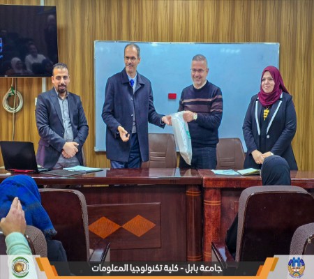تكريم تدريسي في كلية تكنولوجيا المعلومات بمناسبة ترقيته إلى مرتبة أستاذضحى فاضل عباس في إطار دعم المسيرة الأكاديمية وتعزيز ثقافة التميّز العلمي، كرّم السيد عميد كلية تكنولوجيا المعلومات الأستاذ الدكتور وسام سمير بهيه، الأستاذ الدكتور أحمد حبيب سعيد من قسم البرمجيات، بمناسبة ترقيته العلمية من مرتبة أستاذ مساعد إلى مرتبة أستاذ، وذلك تقديرًا لجهوده العلمية والأكاديمية المتميزة وإسهاماته الفاعلة في مجالات التعليم العالي والبحث العلمي، بحضور رئيسة قسم البرمجيات الأستاذة المساعد الدكتورة سرى زكي ناجي وعدد من أعضاء الهيئة التدريسية.ويأتي هذا التكريم تأكيدًا لحرص عمادة الكلية على دعم الكفاءات العلمية وتشجيعها على مواصلة العطاء والارتقاء بالمستوى الأكاديمي، بما يسهم في تعزيز مكانة الكلية العلمية وتحقيق أهدافها في خدمة المسيرة التعليمية والبحثية.
