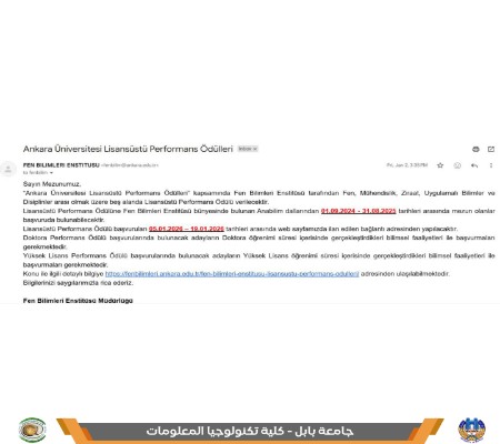 التميز العلمي لقسم البرمجيات في كلية تكنولوجيا المعلومات يثمر عن مشاركة بحثية في جوائز الأداء بجامعة أنقرةضحى فاضل عباس في إطار التميز العلمي والبحثي الذي يشهده قسم البرمجيات في كلية تكنولوجيا المعلومات و تأكيداً على حضوره الأكاديمي الفاعل في المحافل العلمية الدولية تم ترشيح أطروحة علمية متميزة للمشاركة في فعالية جوائز الأداء لطلاب الدراسات العليا التي تنظمها جامعة أنقرةوجاء هذا الترشيح تتويجاً للجهود البحثية التي يبذلها القسم في دعم المشاريع العلمية ذات الطابع التطبيقي و الابتكاري حيث تم اختيار أطروحة الدكتور حيدر فارس ناجي مقرر قسم الدراسة الأولية في قسم البرمجيات الموسومة محاكاة نموذج تعليمي تفاعلي قائم على تقنيات الواقع الافتراضي لما تحمله من رؤية علمية متقدمة تسهم في تطوير بيئات التعليم التفاعلي وتوظيف تقنيات الواقع الافتراضي في العملية التعليميةوضمن فعالية جوائز الأداء بإشراف معهد العلوم في جامعة أنقرة وتشمل خمسة مجالات علمية رئيسية هي العلوم والهندسة والزراعة والعلوم التطبيقية والتخصصات المتداخلة بهدف دعم الإبداع البحثي وتعزيز جودة مخرجات الدراسات العليا على المستوى الدوليويعكس هذا الترشيح المكانة العلمية المتقدمة لقسم البرمجيات وكلية تكنولوجيا المعلومات ويجسد حرصهما المستمر على تشجيع البحث العلمي الرصين والانفتاح الأكاديمي على المؤسسات والجامعات العالمية